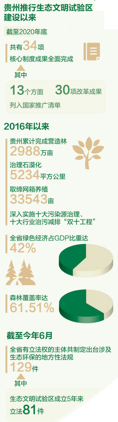 贵州守好发展和生态两条底线。截至2020年底,试验区34项核心制度成果全面完成,其中13个方面、30项改革成果列入国家推广清单,贵州省绿色经济占GDP比重达42%,森林覆盖率达61.51%。