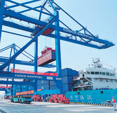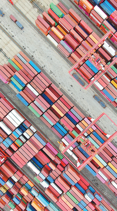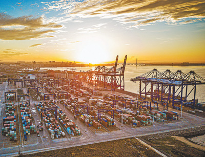 作为水陆交通的重要枢纽、外贸货物进出口的集散地,港口建设对于稳定国际物流体系、发挥水运对外贸的保障作用至关重要。今年上半年,全国港口外贸货物吞吐量达235720万吨,同比增长9.2%,完成集装箱吞吐量13818万标箱,同比增长15.0%。巨轮到港,集装箱鳞次栉比、岸吊装卸迅速高效。港口码头连江接海、作业繁忙,为外贸持续稳定增长提供有力支撑。