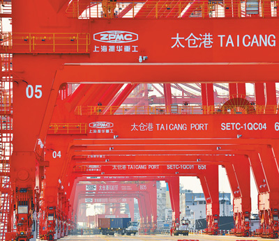 江苏太仓港集装箱码头桥吊林立,集装箱卡车往来穿梭,作业一派繁忙。 |