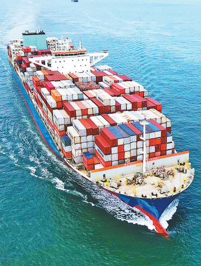 8月7日,山东青岛胶州湾,一艘外贸集装箱货轮在航道上行驶。 |