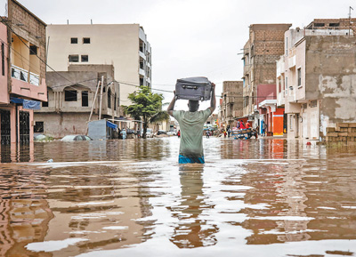 受近日强降雨影响,塞内加尔首都达喀尔遭遇洪涝灾害。图为8月20日,当地一名男子带着从家中搬出的物品涉水前行。 |