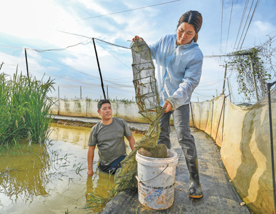 图为日前,在白土镇栗树村生态立体循环种植养殖基地,徐芳(右)与爱人在田间捕捞泥鳅。