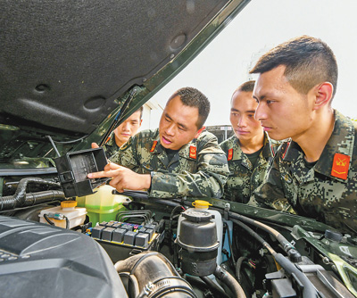 8月23日,武警江苏总队泰州支队开展传帮带活动,组织经验丰富的临退伍老兵向刚刚走上新岗位的战友传经送宝。图为当日,临退伍老兵(左二)正在给走上新岗位的战友传授汽车基本维修知识。