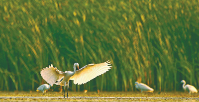 近日,在江苏省连云港市连云区一处湿地的水面上,成群的白鹭或展翅起舞,或栖息觅食,与周边的沙滩、湿地相映成趣,构成了一幅和美的生态画卷。