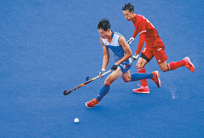 9月17日,在西安举行的第十四届全运会男子曲棍球小组赛比赛中,辽宁队以5∶1战胜陕西队。图为参赛选手在比赛中。