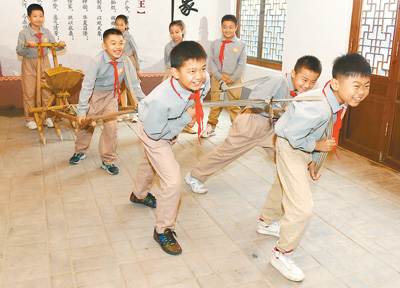 图为9月27日,稷山县稷王小学学生在稷王农耕展区体验先民播种小麦的方式。