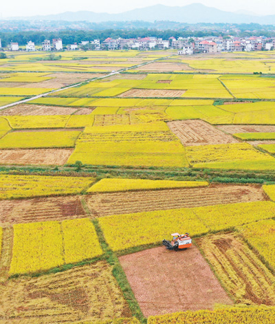 金秋时节,江西省赣州市兴国县的晚稻迎来收获季。图为10月9日,兴国县长冈乡塘石村的农民正在收割晚稻。