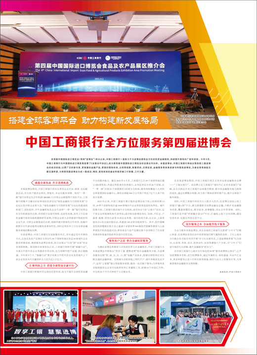 自首届中国国际进口博览会(简称“进博会”)举办以来,中国工商银行一直致力于为进博会提供全方位的优质金融服务,持续提升服务的广度和深度。今年9月,中国工商银行与中国国际进口博览局签署了《全面合作协议》,成为第四届中国国际进口博览会的全面合作伙伴。本届进博会,中国工商银行将结合服务前三届进博会的成功经验,以更广泛的参与度、更智慧的金融产品、更高的服务标准,从招商招展、配套活动、交易促进、金融服务等多维度参与和服务进博会,为参会客商架起互联互通桥梁,为把第四届进博会办成一届成功、精彩、富有成效的盛会积极贡献工行智慧、工行力量。