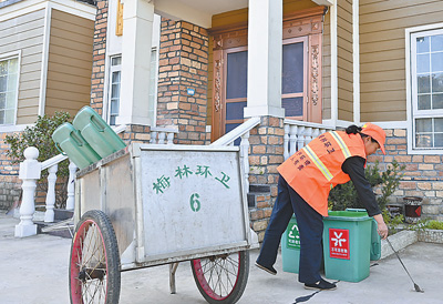 梅林桥村保洁员姜春元在收集生活垃圾。 |