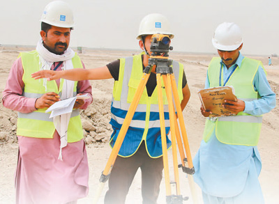 巴基斯坦PKM苏木段公路施工过程中,中巴员工共同开展工程测绘。 |