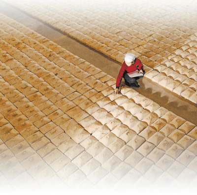 五粮液制曲工人在察看“包包曲”发酵情况。