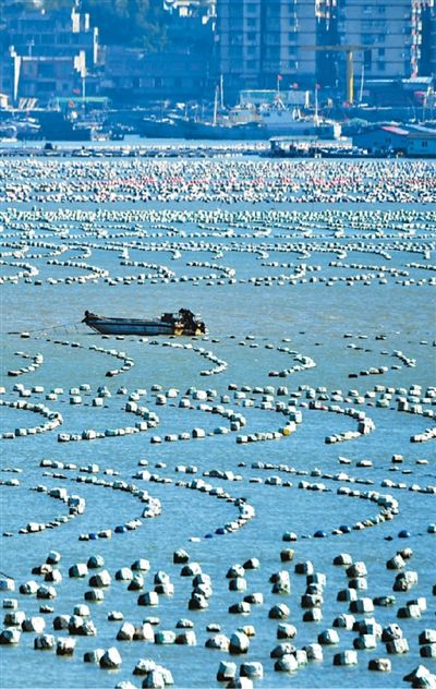 12月1日,在福建省福州市连江县筱埕镇的“海上牧场”,渔民驾船穿梭在一串串彩色浮球和养殖网箱之间,织就一幅海上渔耕图。