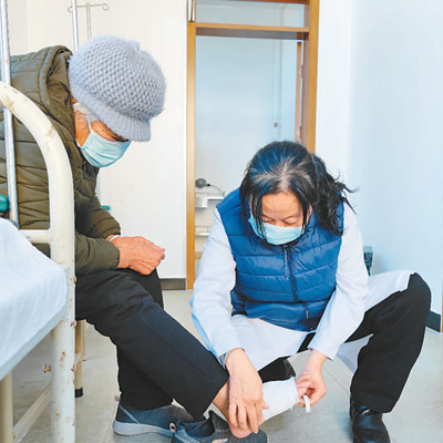 “好嘞,咱到诊室看看。”马爱民给排队的老人量完血压,带着席奶奶走进了诊室,细心地帮奶奶脱下袜子。