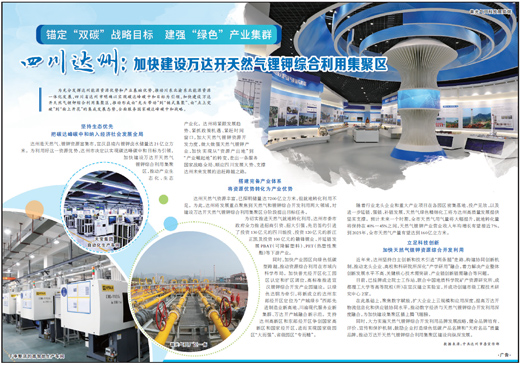 为充分发挥达州能源资源优势和产业基础优势,推动川东北渝东北能源资源一体化发展,四川省达州市明确以实现碳达峰碳中和目标为引领,加快建设万达开天然气锂钾综合利用集聚区,推动形成由“龙头带动”到“链式集聚”、由“点上突破”到“面上开花”的集成发展态势,全面服务国家碳达峰碳中和战略。