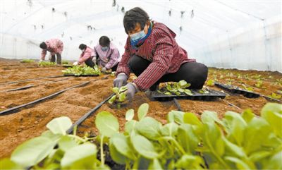 图为栾城区栾城镇柴赵村冯亮种植专业合作社大棚里,农户正在种植菜苗。