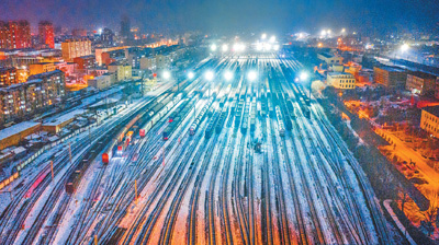 1月22日,内蒙古自治区乌兰察布市普降瑞雪。雪后的乌兰察布市集宁火车站编组站场银装素裹,装满节日物资的货运列车整装待发。