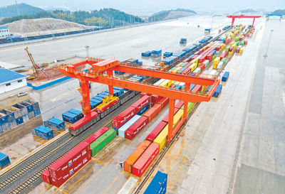 1月22日,浙江省铁路金华永康东站,大型吊机正在将满载电动工具等五金产品的集装箱装入列车车厢。当天,这趟海铁联运班列开往宁波北仑港,随后通关登船出海。