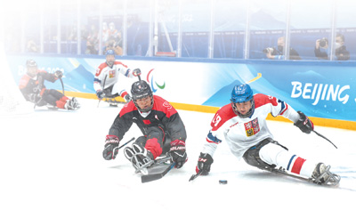 3月9日,北京冬残奥会残奥冰球决赛资格赛在国家体育馆进行,中国队以4∶3击败捷克队晋级半决赛。图为中国队对阵捷克队。 |