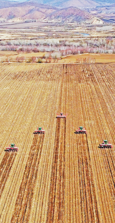 5月7日,大型农机在内蒙古自治区呼伦贝尔农垦大兴安岭集团田间集中播种大豆。 |