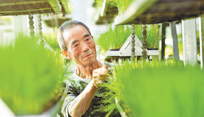 近日,四川省南充市蓬安县及时开展育苗、插秧等工作。图为蓬安县睦坝镇虹管村村民在数智育秧中心查看秧苗情况。 |