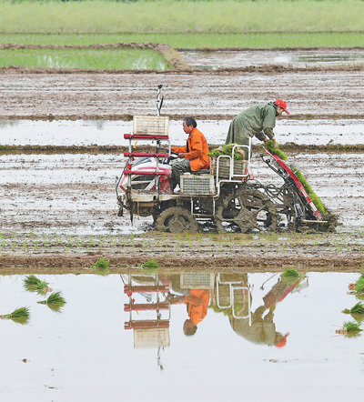 春耕生产开始以来,安徽省各类农业机械化设备在广袤田野中大显身手。4月29日,在合肥市肥西县山南镇龙嘴村水稻种植基地里,村民驾驶插秧机插秧。 |