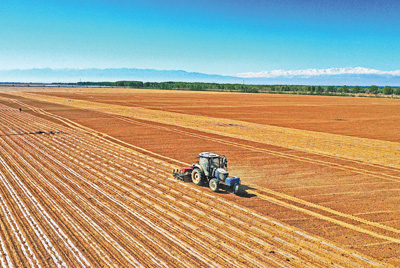 甘肃省高台县合黎镇农业示范区的田野上,覆膜铺管一体机在田垄间铺地膜、施底肥,保障玉米生产。 |