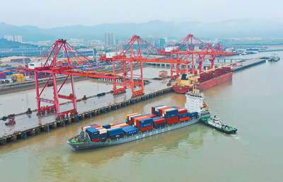 6月6日,浙江台州大麦屿港首次开通出口《区域全面经济伙伴关系协定》(RCEP)国家直航航线,这也是台州市首条外贸集装箱班轮航线。图为装有缝纫机、健身器材等产品的80个集装箱搭乘货轮驶往越南。