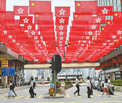 香港尖沙咀,街头挂满中华人民共和国国旗和香港特别行政区区旗。 |