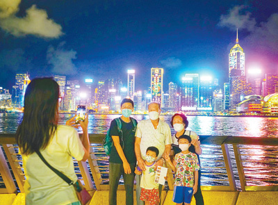 游客在香港尖沙咀的海边合影留念。 |