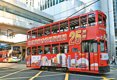 “庆回归”主题电车驶过香港街头,洋溢着浓浓喜庆气氛。 |