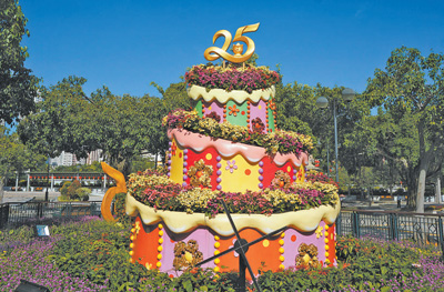 香港沙田公园,以巨型生日蛋糕为主造型的特色园圃五彩缤纷,营造庆祝香港回归祖国25周年的欢乐气氛。 |
