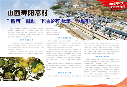 常村位于山西省晋中市寿阳县西南山区,距县城20公里,是“国家梨产业技术体系玉露香梨示范基地”“山西省农村科普示范基地”。如今的常村,整洁宜居、乡风文明,2021年,村民人均收入达3万余元。这一系列沉甸甸的发展成果,都离不开常村坚持支部带村、产业兴村、网格治村、文明润村“四村”融创提升乡村治理能力的发展范式。
