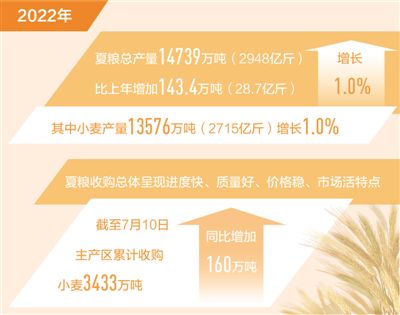 “2022年我国夏粮生产喜获丰收,为稳定全年粮食生产奠定了良好基础,为稳物价保民生、稳定经济大盘、应对外部环境的不确定性提供了坚实支撑。”国家统计局农村司司长王贵荣说。