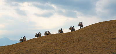 7月17日清晨,安徽省宣城市泾县,工人在运送宣纸制作原料并进行摊晒。据了解,古法宣纸制作技艺由108道工序组成,摊晒是其中重要的步骤之一。水稻秸秆作为宣纸的重要原材料,经过多道工序后,用于宣纸的制作。