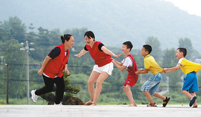 图为7月19日,新余市仙女湖区钤阳办事处昌田村乡村书院,孩子们在志愿者的组织下开展趣味互动游戏。