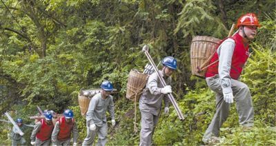湖北省利川市谋道镇,谋道供电所党员服务队队员背着电力维修器材行进在山路上。 |