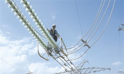 南方电网云南输电分公司带电三班高级作业员郑瑞东在离地面30多米的高空带电作业现场更换电力组件。 |