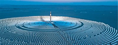 甘肃省敦煌市光电产业园区内,万余面定日镜以同心圆状围绕着260米高的吸热塔,把“光”变成“电”。 |