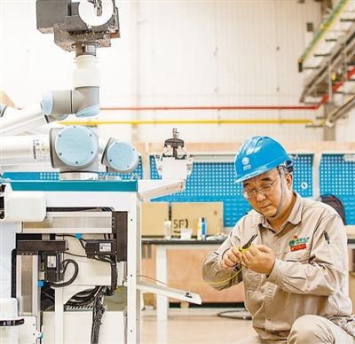 国网天津滨海公司运检部配电运检室配电抢修班班长张黎明对配网带电作业机器人进行技术调试。 |