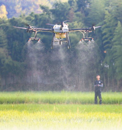 8月4日,浙江杭州临安区天目山镇“天目粮仓”粮食基地,农技人员遥控植保无人机对水稻进行喷药除虫作业。 |