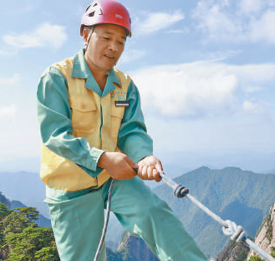 今年,是李培生在黄山风景区工作的第二十五个年头。从最初的检票工作,到后来的路段保洁,1999年6月,李培生转岗到了放绳队,成为黄山风景区玉屏环卫所的一名放绳工。