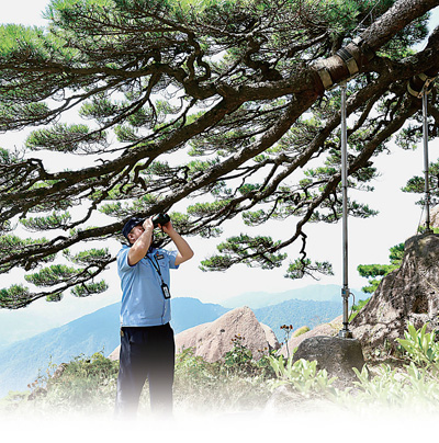 每天早上7点,胡晓春便开始了巡护观测工作。监测松树枝丫、松针和树皮的细微变化,检查支撑架、拉索、防雷设施情况……“白天每隔两小时进行一次例行检查,如遇雷暴等天气,每半个小时就要巡查一次。夜间则启动红外线防侵入报警系统,随时随地查看迎客松情况。”胡晓春说。