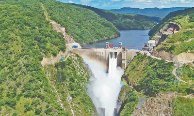 位于刚果(金)卢阿拉巴河下游的布桑加水电站,由中国中铁资源集团投资建设并运营。水电站总装机容量240兆瓦,自2021年11月底运行以来,有效缓解了该国电力短缺,积极促进了当地经济社会发展。图为布桑加水电站正在泄洪。
