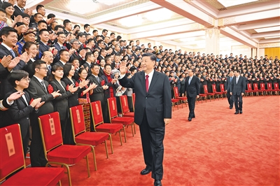 上午11时,习近平等来到人民大会堂北大厅,全场响起热烈掌声。习近平等走到代表们中间,同大家亲切交流并合影留念。
