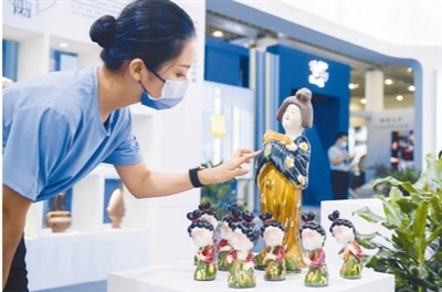图为参观者正在欣赏唐三彩作品“贵妃出游”。