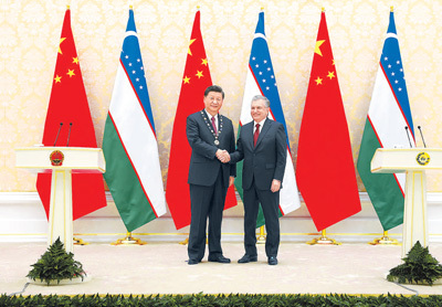 习近平致答辞。习近平指出,米尔济约耶夫总统向我授予“最高友谊”勋章,充分体现出乌方对中乌关系的高度重视,以及乌兹别克斯坦人民对中国人民的深情厚谊。乌兹别克斯坦著名诗人纳沃伊说:“没有比生活在友谊之中更美好的事情。”早在两千多年前,中乌两个伟大民族就以丝绸之路为纽带,互通有无、互学互鉴。30年前,中乌建交,开启了两国人民友好新篇章。两国全面战略伙伴关系实现跨越式发展,各领域合作取得丰硕成果,有力促进了各自发展振兴,也为维护中亚地区乃至世界和平稳定注入了正能量。我和米尔济约耶夫总统商定,深化新时代中乌全面战略伙伴关系,致力于践行中乌命运共同体。中方愿同乌方一道努力,谱写中乌友好新篇章。