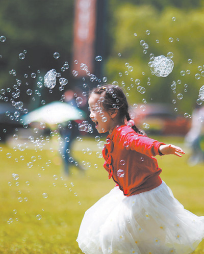 江苏省扬州市风筝广场,一个小朋友在玩泡泡。 |