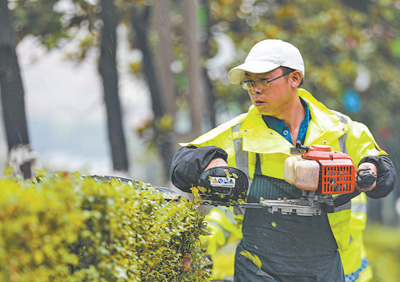贵州省黔西市莲城街道莲城金街,园艺工人忙着修剪绿化带。 |
