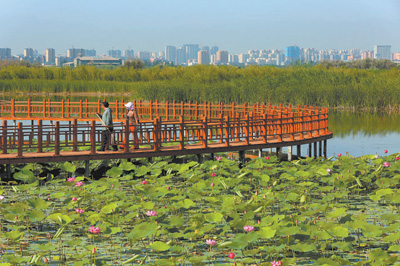 甘肃省张掖国家湿地公园湖泊步道上,保洁员正在巡查公园卫生,确保为游客提供舒心环境。 |