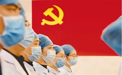 在新冠肺炎疫情防控中,广大党员医护人员白衣为甲、逆行出征。图为2020年2月3日,湖南省郴州市第三人民医院在隔离病区成立临时党支部。 |